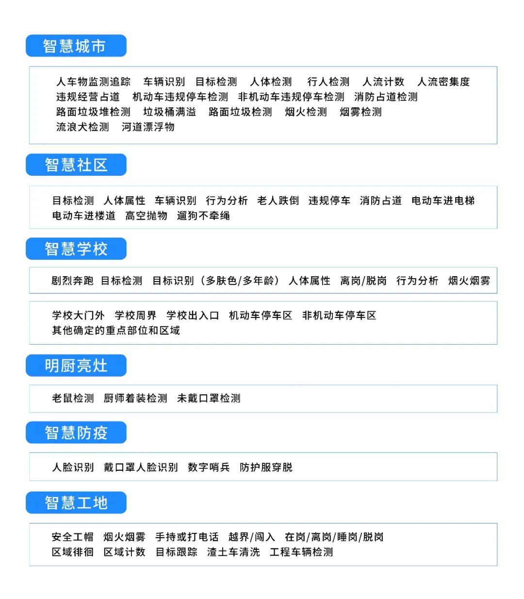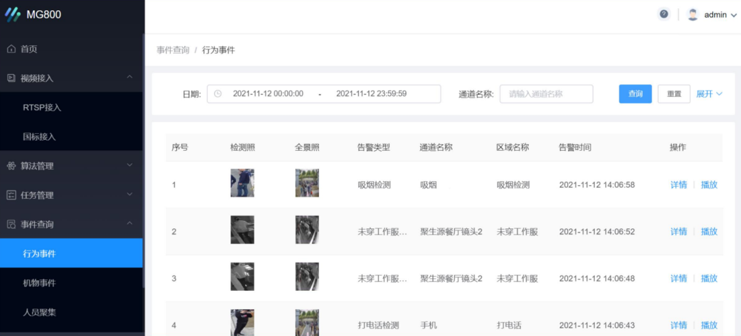算法多樣,安全事件主動發(fā)現(xiàn) 基于視頻智能分析算法,MG800 可提取視頻中人員、物品、行為、事件等要素,對視頻流進行智能化、標簽化分析,告警異常事件,預防潛在風險。算法涵蓋智慧城市、智慧社區(qū)、智慧學校、明廚亮灶、智慧防疫、智慧工地等,可對城市運行、基層治理、城市管理、行政執(zhí)法中的多種場景進行智能識別。